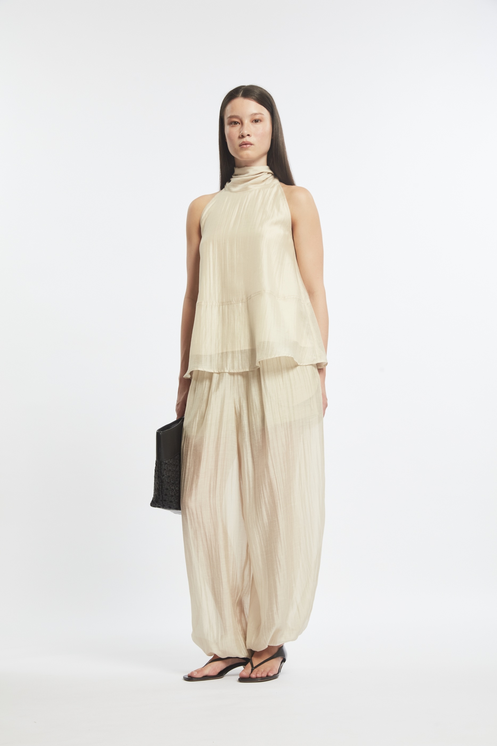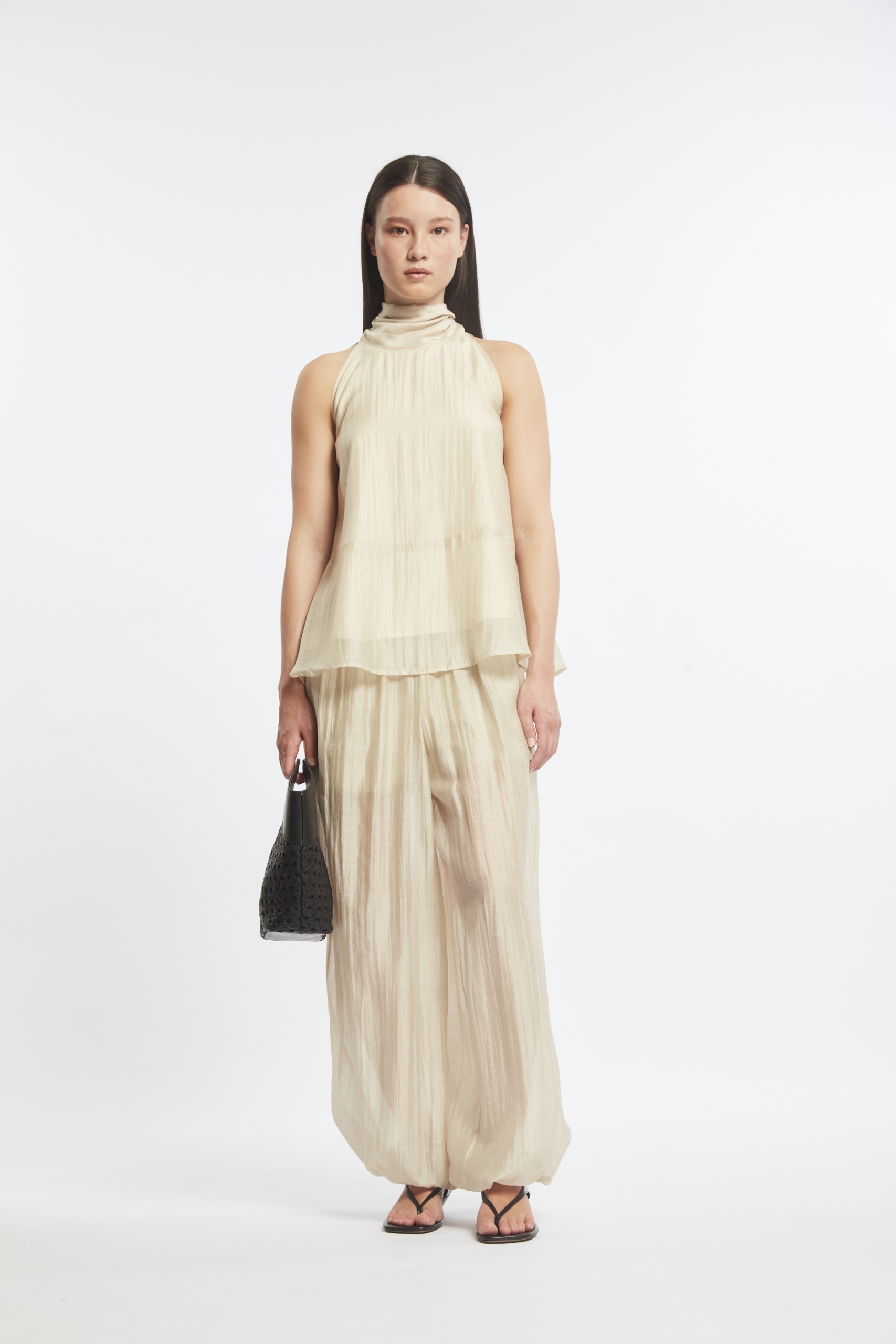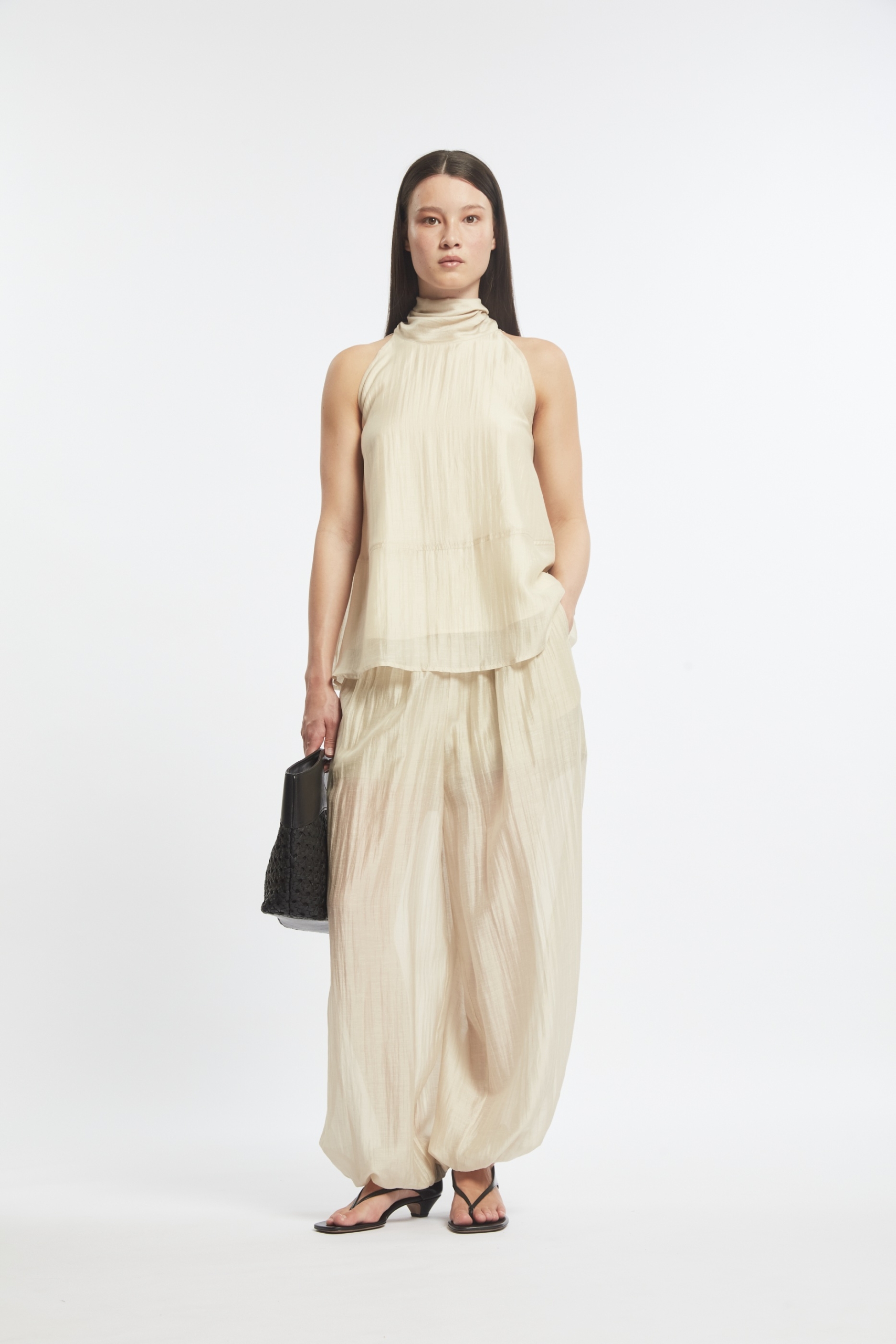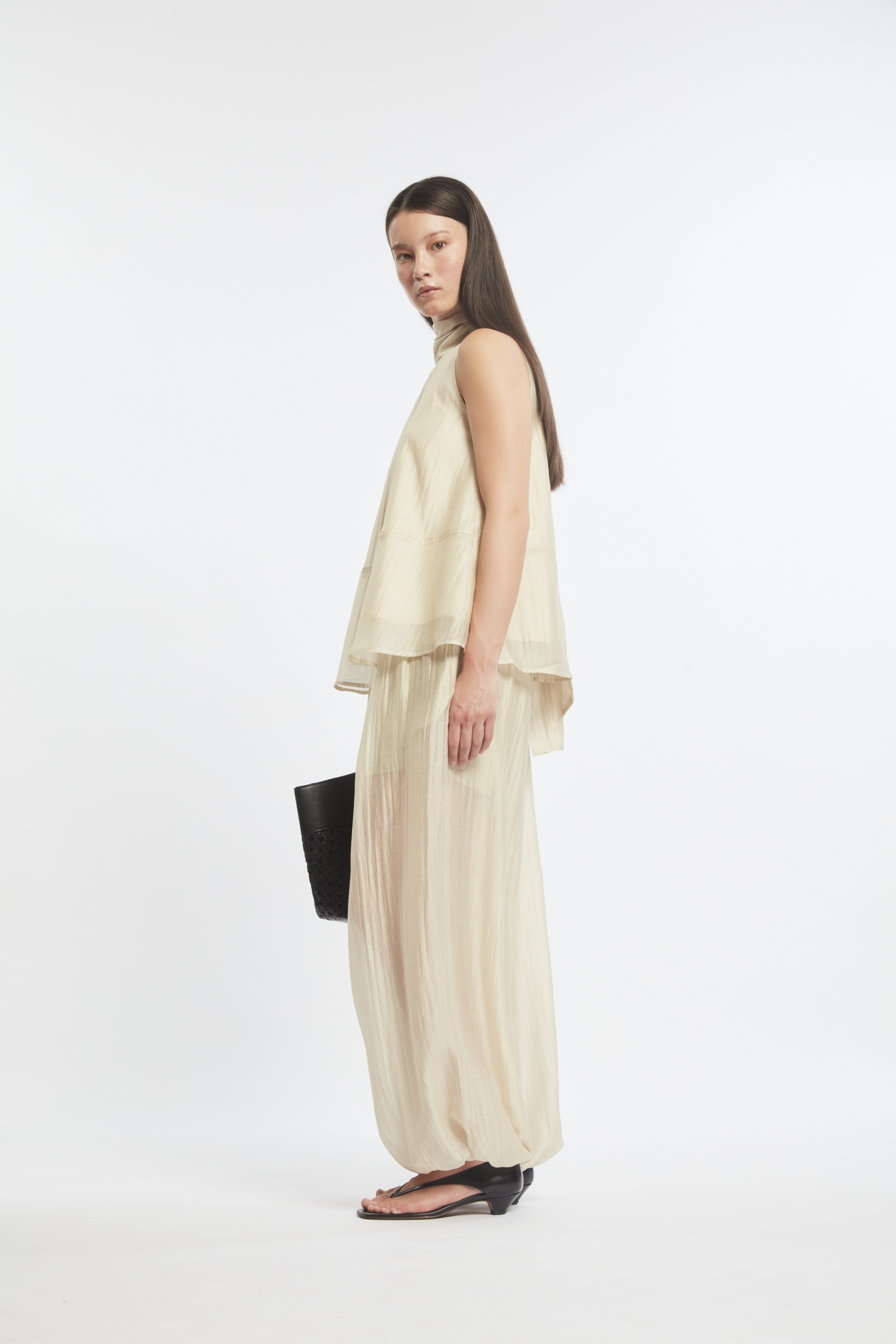A fluid pant with a soft, sculptural silhouette. The Hale pant is designed with a relaxed shape through the leg, gently gathered at the ankle to create a rounded form with a sense of movement.